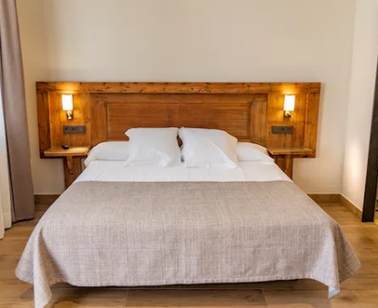 RIERA; Chambre double avec une petite terrasse. Elle est décorée en combinant des éléments modernes avec des éléments anciens, comme une tête de lit en bois réalisée à partir de portes anciennes ou l'armoire d'origine de la maison. Equipée d'un lit double 180x190cm et d'un éclairage domotique. Il dispose également de tous les équipements nécessaires pour offrir un maximum de confort.